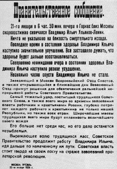 Lenin, the leader of the Bolsheviks, died of a stroke in 1924.